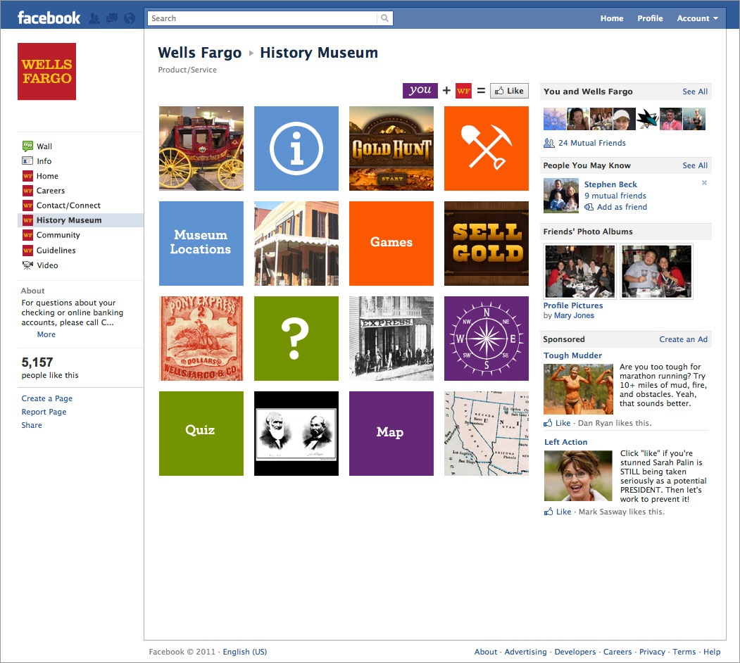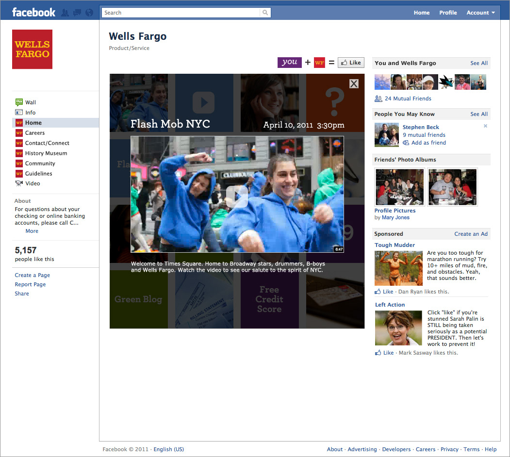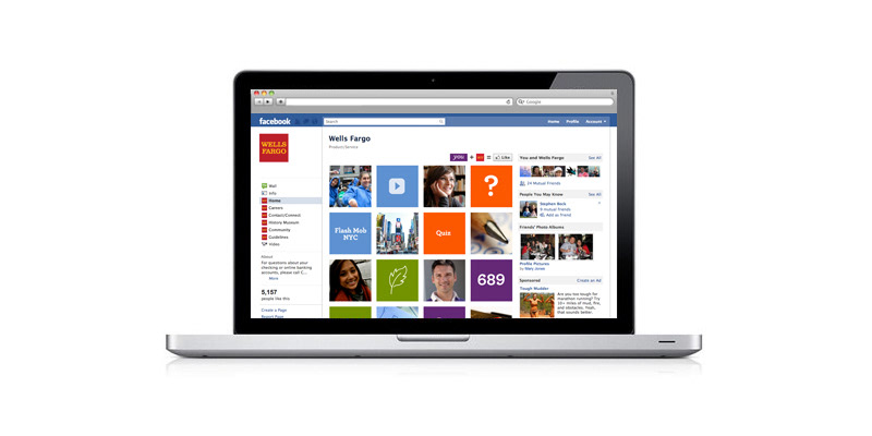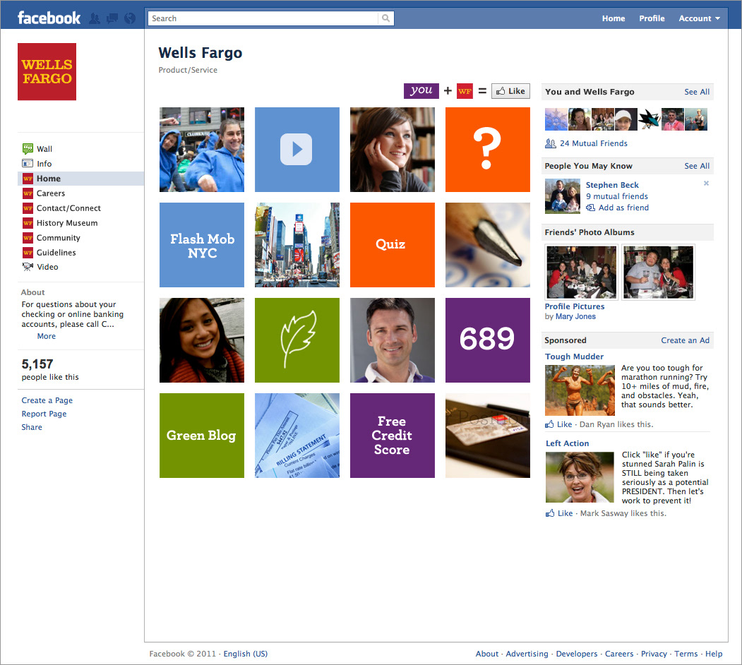 Redesign of the Wells Fargo facebook presence. The new page serves as a portal for Wells Fargo lines of business to engage with their customers and appeal to new prospects. It is the cornerstone of Wells Fargo's Social Marketing strategy.